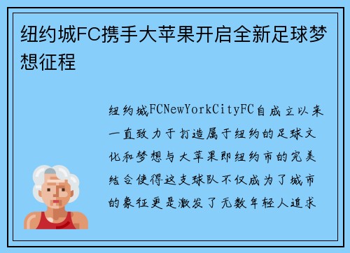 纽约城FC(New York City FC)自成立以来,一直致力于打造属于纽约的足球文化和梦想。与大苹果(即纽约市)的完美结合,使得这支球队不仅成为了城市的象征,更是激发了无数年轻人追求足球梦想的动...